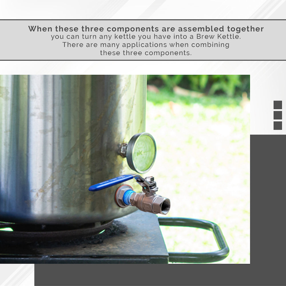 Ball Valve is pictured with a Hex Nipple and an EZ Seal Weldless Bulkhead to illustrate use.