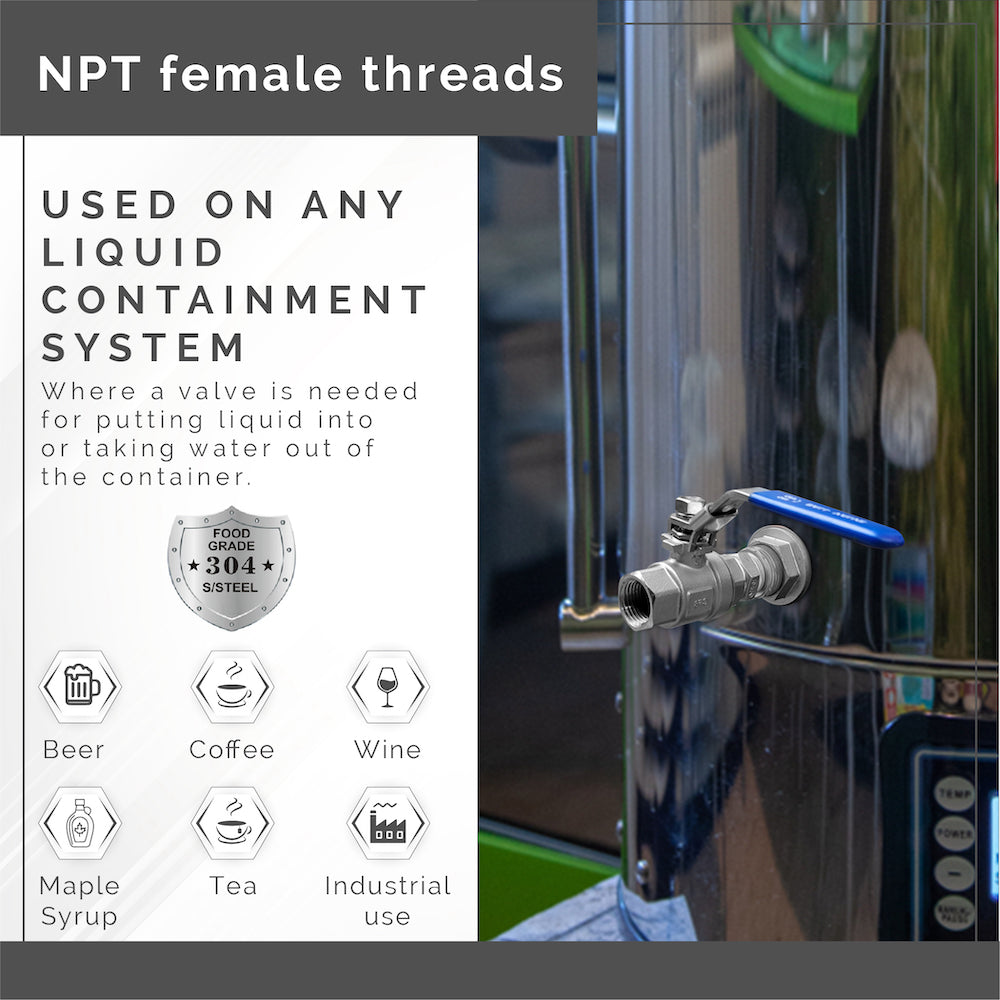 Made from 304 Stainless Steel, our quarter turn valve, is used for the racking port, and yeast port on all our fermenters. Equipped with a safety release so it cannot be turned on accident.
