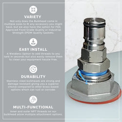 Use with 1/2” NPT Female Threaded Weldless Bulkhead Fitting, thus creating a Cornelius Keg out of any pressure vessel.