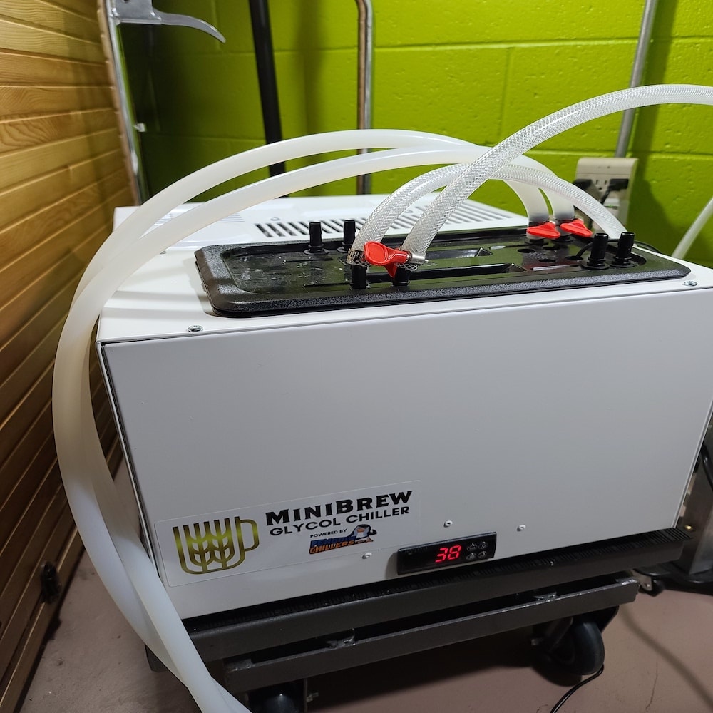 The controller on the Glycol Chiller will regulate the temperature of the glycol reservoir ensuring there is always cold glycol on hand, to be sent out as needed to cool the fermenters.